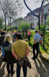 Am 13.04.2024 konnten wir bei schönstem Sonnenschein unseren historischen Stadtrundweg offiziell einweihen. Ca. 20 Interessierte – unter Ihnen auch Bürgermeister Sven Gabriel – folgten der Einladung und begaben sich auf eine gemeinsame Entdeckungstour durch die Stadt. Jede Stele, mit ihrem jeweils repräsentativen Bauwerk, erhielt dabei ihre eigene kleine Vorstellung und individuelle Präsentation. Und auch von den Gästen selbst kamen immer wieder interessante oder wissenswerte Anmerkungen zu einzelnen Gebäuden oder Personen. Im Hof des ehem. Gefängnisses wurde bei einem Glässchen Sekt eine kurze Rast eingelegt, um sich auch für den Rest des Weges zu stärken.
