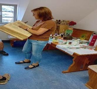 Auf dem von Ihr aufgebauten Kräutertisch waren die verschiedensten Zubereitungen der Heilkräuter, wie sie früher und heute Verwendung finden, ausgestellt. In Pflanzenschalen konnten seltene, aber auch ganz häufige am Wegesrand wachsende Kräuter begutachtet werden. Ein Herbarium mit 60 Pflanzen war ebenfalls ausgestellt. Besonderes Interesse weckte ein antiquartiertes Kräuterbuch in der Originalausgabe aus dem Jahre 1731.