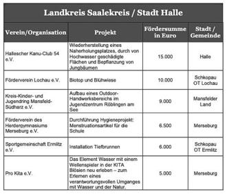| - | Seit 2010 wurden 273 Projektideen aus dem Saalekreis, dem Landkreis Leipzig und den Städten Halle und Leipzig unterstützt |