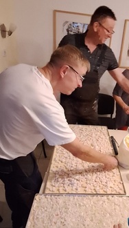 Am frühen Samstagmorgen musste trockenes Holz gesucht werden, das Wetter war leider sehr regnerisch. Im Gebäude des Heimatvereins war es aber kuschlig warm, der Teig für den Speckkuchen und die Döllnitzer Schnitte wurde vorbereitet.
