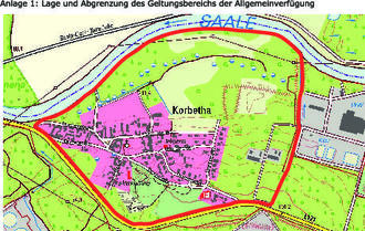 Geltungsbereich: Die Allgemeinverfügung gilt für den Bereich der Gemarkung Korbetha, welcher durch die Landesstraße “L171“, durch das Fließgewässer I. Ordnung “Saale“ und durch das Gelände des Wasserwerks [Dow Olefinverbund GmbH] begrenzt wird.