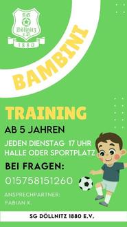 Jeden Dienstag findet das Bambinitraining in der Turnhalle oder auf dem Sportplatz statt. Im Fokus stehen motorischen Grundübungen sowie fußballorientierte Spiele zum erlernen des Ballgefühls. Spaß steht hierbei an oberster Stelle. Wir nehmen bereits in regelmäßigen Abständen an Turnieren teil und würden uns über weiter Kinder in unserer Mannschaft freuen. Meldet euch gerne oder kommt direkt zum Schnuppertraining vorbei.