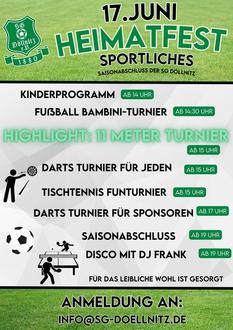 Die Fußballsaison neigt sich allmählich dem Ende entgegen und wir möchten uns mit einem sportlichen Heimatfest gebührend verabschieden. Egal ob groß oder klein, Mitglied oder nicht - jeder ist herzlich eingeladen!