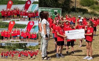 Mit einem Gemeinschaftstanz aller Grundschulkinder begann am Mittwoch, 25.6.25, die Präsentation der Ergebnisse unserer Tanzwoche auf dem Sportplatz der SG Döllnitz. Bevor jede Klasse ihren Tanz zeigte, überreichten Valentina und Oskar, beide Kinder liefen am 4. Juni 33 Runden (!), der Leiterin des AKJH, Frau Werneburg, unseren Spendencheck.