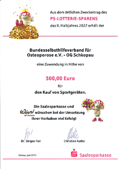 Am 6. Juni 2023 haben wir in Ostrau mit Freude erstmalig eine Zuwendung von der Lotteriegesellschaft der Ostdeutschen Sparkassen mbH in Höhe von 500 € entgegengenommen für den Kauf von Sportgeräten.