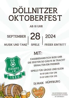 Am 28. September lädt die SG Döllnitz zu ihrem Oktoberfest auf dem Sportplatz ein. Los geht es ab 18:00 Uhr, und die ersten 50 Gäste in Tracht dürfen sich jeweils über ein Freibier freuen.