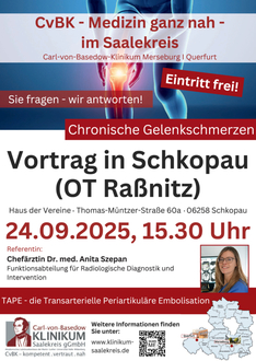 Das Carl-von-Basedow-Klinikum Saalekreis gGmbH lädt am Mittwoch, den 24. September 2025, um 15:30 Uhr zur Veranstaltungsreihe „Medizin ganz nah“ in das Haus der Vereine in Schkopau ein. Im Mittelpunkt steht ein innovatives Verfahren zur Behandlung chronischer Gelenkschmerzen.