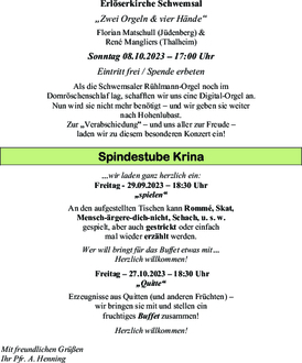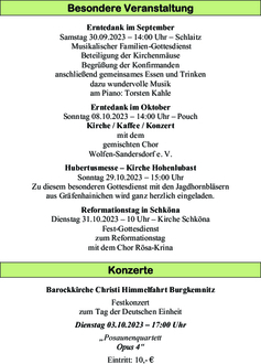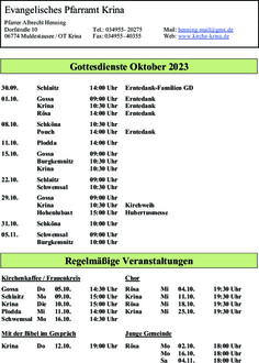 | 30.09. | Schlaitz | 14:00 Uhr | Erntedank-Familien GD |