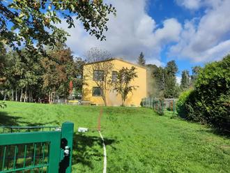 Vor Ort angekommen bestätigte sich die Lage: Das Erdgeschoss und der gesamte Keller standen in dichtem Rauch und mehrere Personen wurden vermisst. Zusammen mit den Kameraden der Feuerwehr Scheibenberg gingen mehrere Trupps unter schwerem Atemschutz zur Menschenrettung vor. Zeitgleich wurde durch die Kameraden der Feuerwehr Dörfel eine stabile Löschwasser Versorgung aufgebaut. Die restlichem Kameraden der Wehren bekämpften den fiktiven Brand im Außenbereich.