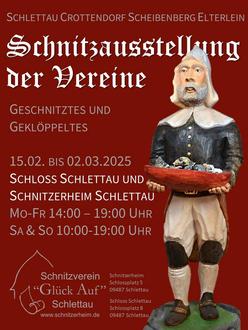Von 15. Februar 2025 bis 2. März 2025 laden die Schnitzvereine aus Schlettau, Crottendorf, Scheibenberg und Elterlein zu einer besonderen Schnitzausstellung ein. Die Ausstellung findet auf Schloss Schlettau sowie im benachbarten Schnitzerheim statt und ist von Montag bis Freitag 14 bis 17 Uhr und am Wochenende 10 bis 19 Uhr geöffnet.