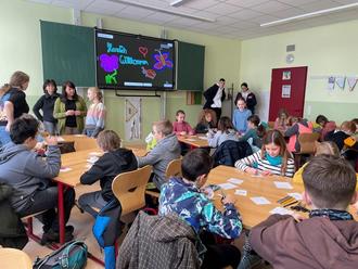 Direkt danach, um 10:00 Uhr, wurde es kreativ: Bei Frau Weber und Frau Reichmann bastelten die Kinder bunte Anstecker und lösten spannende Rätsel. Wenig später, um 10:20 Uhr, ging es weiter in den Kunstraum, wo Frau Rathner und ihre Tochter mit den Grundschülern Frisbeescheiben gestalteten.