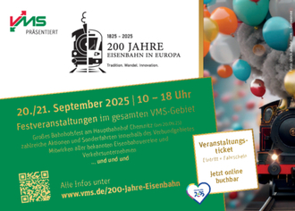 Das dürft ihr nicht verpassen: Am 20. und 21. September 2025 steigt das größte Bahnfest der Region! Der Verkehrsverbund Mittelsachen (VMS) feiert gemeinsam mit zahlreichen Eisenbahnvereinen, Verkehrsunternehmen und Partnern „200 Jahre Eisenbahn in Europa“. Kommt mit auf eine einzigartige Reise durch die Geschichte der Eisenbahn! Nachfolgend erfahrt ihr alles rund um den Eventhöhepunkt des Jahres und wie ihr an Tickets kommt. Sonderfahrten und Aktionen im gesamten VMS-Verbundgebiet Vor zwei Jahrhunderten begann eine neue Ära der Mobilität: Die erste Eisenbahn fuhr auf europäischem Boden in England. Dieses bedeutende Jubiläum nimmt der VMS zum Anlass, der Eisenbahn im Kulturhauptstadtjahr 2025 ein ganzes Festwochenende zu widmen. An 22 Orten im gesamten Verbundraum laden mehr als 40 Veranstaltungspartner zu spannenden Aktionen rund um die Eisenbahn ein. Das Festwochenende fällt dabei mit dem deutschlandweiten Tag der Schiene zusammen. Erleben – Staunen – Mitfahren