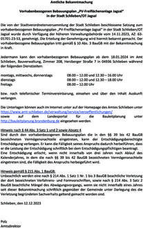 Die von der Stadtverordnetenversammlung der Stadt Schlieben beschlossene Satzung zum vorhabenbezogenen Bebauungsplan „PV-Freiflächenanlage Jagsal“ in der Stadt Schlieben/OT Jagsal wurde durch Verfügung der höheren Verwaltungsbehörde vom 14.11.2023, AZ: 63-01701-23-53, genehmigt. Die Erteilung der Genehmigung wird hiermit bekannt gemacht. Der vorhabenbezogene Bebauungsplan tritt gemäß § 10 Abs. 3 BauGB mit der Bekanntmachung in Kraft.