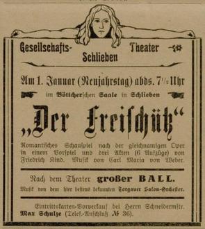 Die Abbildung zeigt einen alten Ordner des Vereins mit den gesammelten handschriftlichen Dokumenten. In den Wintermonaten gab es jeweils 4 bis 8 Aufführungen, wobei die Einladungen mit den Programmen auf Zetteln an die Bevölkerung verteilt wurden. Die Übernahme von Theaterstücken und Operetten, die gerade in Berlin und anderen großen Städten modern waren, garantierte große Besucherzahlen und begeisterte Aufnahme. Das dem Schliebener Stadt- und Landboten entnommene hier wiedergegebene Inserat von Ende Dezember 1922 weist mit dem Freischütz auf eine anspruchsvolle Aufführung hin.