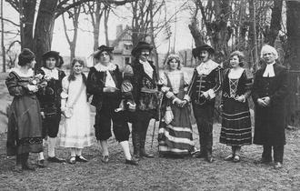Auf der folgenden Abbildung sind neun Mitglieder des Schliebener Theatervereins Ende der 1920er Jahre in den für ihren Auftritt notwendigen Kostümierungen zu sehen. Die Fotografie ist auf der Anhöhe gegenüber dem Böttcherschen Saale, dem späteren Lindenhof, aufgenommen worden. Da die Bäume ohne Blätter sind, erfolgte die Aufnahme offensichtlich im Winter vor oder nach einer Aufführung. Die zweite Person von links ist der Leineweber und Landwirt Otto Kunze aus der Langen Straße, die dritte seine Schwester Frieda und die vierte der bekannte Schuhmacher Karl Gerloff. Ältere Mitbürger erinnern sich beim Blick auf die historische Fotografie sicher noch an den einen oder anderen Mitspieler. Ein ähnliches Bild an der gleichen Stelle aufgenommen mit 35 aktiven Schauspielern ist in dem Buch von Hans-Dieter Lehmann "Die Geschichte des Schliebener Landes" enthalten. In seinem Buch "Was Großvater einst in der Zeitung las, Band III" sind, vermutlich vor dem Schützenhaus, 44 Schliebener Theatervereins-Mitglieder zu sehen.