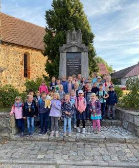 … und schon waren für uns Schülerinnen und Schüler der 1. und 2. Klasse die ersten Schulwochen vorüber. Wandertag war angesagt. Da lag Aufregung und Spannung in der Luft. Wir wollten unseren Schulstandort Hohenbucko erkunden. Mit Fibel-Mimi und Ferngläsern im Gepäck ging es zunächst zur Kirche. Wussten Sie, welch besonderes Tier die Wetterfahne dieses Gebäudes schmückt? Wir haben es entdeckt! Frau Krüger hat uns die Geschichte zum Tier auf der Wetterfahne vorgelesen. Das war interessant! Anschließend besichtigten wir das Denkmal vor der Kirche und Frau Schmidt erzählte uns, warum es errichtet wurde. WIR DANKEN HERRN ARNDT für die Unterstützung! Nun meldete sich der kleine Hunger – wir schauten beim Bäcker vorbei. Und siehe da – jeder bekam ein frisch gebackenes Brötchen geschenkt. Nicht nur dies, auch eine kleine Süßigkeit dazu. WIR SAGEN VIELMALS DANKE! Herr Strätz servierte uns heiße Würstchen dazu – da war unser Picknick am Dorfteich ein herrlich leckeres Päuschen. In Frau Krügers Erzählung war vom Tal die Rede. Dieses suchten wir wohl gestärkt. Wir wanderten bis zur Bergspitze und schauten ins Tal – dem Hohenbuckoer Bahnhof. Entlang der Kuhställe sollte unser letztes Abenteuer-Bildungsziel die Postsäule zu Hohenbucko sein. Leider verfehlten wir es, weil wir nicht rechts, sondern links abgebogen sind und landeten auf dem Spielplatz. Kurz entschlossen und vergnügt spielten wir noch ein paar Minuten bis es zur Schule zurückging. Nun bleibt unser Ziel – die Postsäule zu besuchen – für eine nächste Wanderung bestehen.