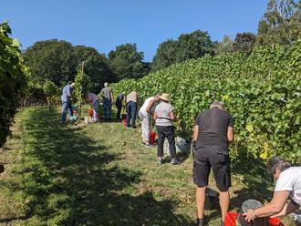 Besonders eilig hatte es in diesem Jahr der Müller-Thurgau und produzierte einen hohen Zuckergehalt aber bei nachlassender Säure – er musste deshalb als erstes geerntet werden. Am Freitag, 8. September, haben über 40 Vereinsmitglieder und Helfer gemeinsam nach ca. 2 Std. 3.694 kg Müller-Thurgau mit 78 °Oechsle (°Oe) gelesen. Nach der Lese gab es für alle einen Imbiss sowie Federweißen und Wein, gemütlich und gut gelaunt wurde noch eine Weile geplauscht, ehe es nach Hause ging.