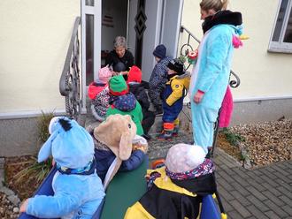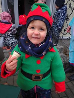 Bunt verkleidet von Haus zu Haus zogen die Kindergartenkinder durch das Dorf. Auch das regnerische Wetter hielt uns davon nicht ab. Wir trafen viele Bewohner an, welche uns mit leckeren Köstlichkeiten versorgten.