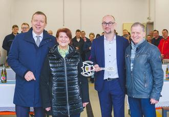 Landrat Christian Jaschinski (l.) übergab im Beisein von Schliebens Bürgermeisterin Cornelia Schülzchen (2.v.l.) und Bernd Heinke, Vorsitzendender des Werksausschusses Rettungsdienst (r.), den symbolischen Schlüssel an den Leiter des Eigenbetriebes Rettungsdienst, Sebastian Weiss (2. v. r.) (Foto: Social Media Team Landkreis Elbe-Elster)