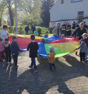 Und dann gab es noch einen Höhepunkt. Bei schönstem Wetter begrüßten wir gemeinsam mit unseren Eltern, Großeltern, Einwohnern und Gästen in Lebusa den Mai. Mit dem Schwungtuch besangen wir den immer wiederkehrenden Frühling, lockten die Insekten hervor mit dem Bienentanz und zeigten, was wir tun, wenn wir fröhlich sind.