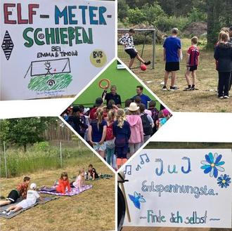 Wie jedes Jahr ist es an unserer Grundschule Tradition, dass die sechste Klasse stets das Fest für den Kindertag organisiert. Und so kam es auch in diesem Jahr am 02.06.2023. Mit Spiel- und Sportstationen reichte das Feld der Angebote von Yogaübungen über Elfmeterschießen und Kirschkern-Weitspucken bis hin zu eigens dafür aufgebauten Hindernisparcours. Die SchülerInnen aus allen Jahrgängen waren sichtlich begeistert und wollten den Tag gar nicht so recht enden lassen, wäre da nicht noch die große Überraschung auf dem Schulhof gewesen. Denn die von den großzügigen Geldspenden als auch vom Erlös der Schul-Tombola gekauften Spielgeräte (eine große Kiste voller Bälle, Frisbees, Jonglierringe, ein zweites Fußballtor und ein Basketballkorb), wurden feierlich eröffnet und im Anschluss natürlich sofort von allen Kindern eingeweiht.