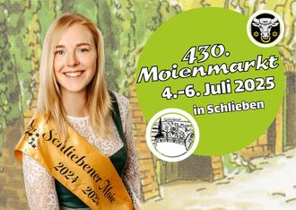 Vom 4. bis 6. Juli 2025 feiert Schlieben wieder seinen traditionellen Moienmarkt und bietet seinen Besucherinnen und Besuchern über das Wochenende auf zwei großen Bühnen verschiedene Live-Shows. Das Programm zum Festwochenende finden Sie in dieser Ausgabe der Amtsnachrichten sowie unter www.moienmarkt.de.