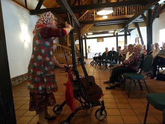 In Schlieben startete die Seniorenwoche am Dienstag, 6. Juni, im Drandorfhof nach der Eröffnung durch den Amtsdirektor mit einem Comedy-Programm. Frau Birnstein nahm in ihrem Programm „Rolle vorwärts“ leicht torkelnd ob ihres unorthodoxen Biergenusses und sich krampfhaft an einem umgebauten Rollator festklammernd die Tücken des Rentnerdaseins aufs Korn. Ob es die scharf- und hintersinnige Beschreibung eines Senioren-Einkaufes bei IKEA ist oder die Drohung des Arbeitsamtes, dass sie trotz ihrer Gebrechen bei einer Erhöhung des Renteneintrittsalters auf 75 Jahre plötzlich wieder auf Arbeit gehen müsste. Die „alte Dame“ unterhielt mit ihrem scharfsinnigen, doppeldeutigen und teilweise derben Wortwitz über 40 Seniorinnen und Senioren, die sie auch mit ihrer unnachahmlichen Situationskomik und Schlagfertigkeit ins Programm einbezog. Mit viel Beifall und einer Flasche Schliebener Wein, überreicht von Dr. Jürgen Wolf, wurde sie nach einer Stunde verabschiedet.