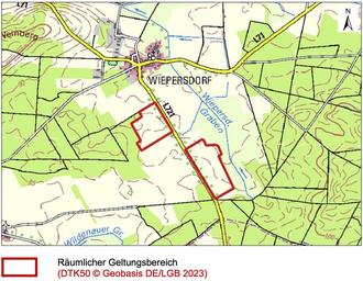 Der Geltungsbereich des Bebauungsplans umfasst eine Gesamtfläche von 34,83 Hektar und beinhaltet in der Gemarkung Wiepersdorf der Flur 6 die Flurstücke 43, 44, 51, 52 jeweils vollständig und die Flurstücke 54, 55, 56,57 jeweils teilweise, begrenzt im Westen durch die L721, im Norden durch Acker, im Osten durch Grünland, im Süden durch Acker und in der Flur 7 die Flurstücke 51, 52, 55 jeweils vollständig und die Flurstücke 50, 54 jeweils teilweise, begrenzt im Westen durch Wald, im Norden durch einen Feldweg, im Osten durch die L721, im Süden durch Acker.