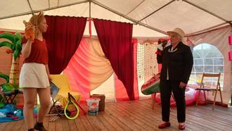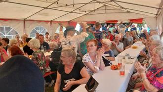 Das gemütliche Beisamensein startete mit Kaffee und einem reichlichen Kuchenbuffet. Schnell waren die Bänke im Zelt gefüllt, weil alle Anwesenden gespannt auf die Theatergruppe Ahlsdorf warteten. „Sommer, Sonne, Sonnenschein“ – Herr Fuchs und Frau Elster eröffneten ihr Reisebüro und brachten Urlaubsreisen unter die Leute. Da war der Spaß vorprogrammiert. Viele bekannte Lieder zum Mitsingen luden die Gäste zum Mitmachen ein. Sketsche und allerlei Klamauk brachten die Leute zum Lachen.