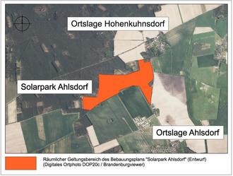 Mit der Aufstellung des Bebauungsplanes sollen die planungsrechtlichen Voraussetzungen für die Errichtung einer Freiflächen-Photovoltaikanlage geschaffen werden. Das Plangebiet befindet sich in der Gemarkung Ahlsdorf und liegt nordwestlich der Ortslage Ahlsdorf. Es weist eine Größe von 60,0 Hektar auf. Zum Plangebiet gehören die folgenden Flurstücke: Gemarkung Ahlsdorf, Flur 1: 16, 48, 49, 50, 51, 52, 53, 54, 55, 56, 57, 58, 59, 117, 141/1, 142, 143, 144, 145, 175, 210, 211, 239, 240, 241, 242, 244, 245, 246, 247, 248 (alle vollständig) sowie 8, 9, 10, 11, 12, 13, 14, 42, 43, 47, 60, 61, 62, 72, 73, 108, 109, 111, 121, 126, 128, 133, 140, 146, 186, 190, 192, 194, 196, 198, 200, 202, 204, 206, 208, 238, 243, 249 (alle teilweise). Das Plangebiet wird derzeit intensiv landwirtschaftlich genutzt und ist unbebaut. Die Erschließung des Plangebietes ist über die Kreisstraße K 6251 gesichert.