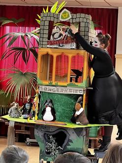 Mit diesem Puppentheater begeisterte die Puppenspielerin Julia Raab aus Halle/Saale in diesem Jahr unsere Kinder der Grundschule. Doch nicht nur die Kinder waren begeistert, sondern auch die Erwachsenen. Es wurde gesungen, geklatscht und gerappt. Zum Schluss siegte, Gott sei Dank, das Gute.