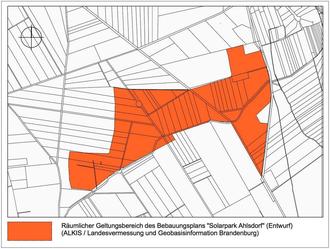 Mit der Aufstellung des Bebauungsplanes sollen die planungsrechtlichen Voraussetzungen für die Errichtung einer Freiflächen-Photovoltaikanlage geschaffen werden. Das Plangebiet befindet sich in der Gemarkung Ahlsdorf und liegt nordwestlich der Ortslage Ahlsdorf. Es weist eine Größe von 60,0 Hektar auf. Zum Plangebiet gehören die folgenden Flurstücke: Gemarkung Ahlsdorf, Flur 1: 16, 48, 49, 50, 51, 52, 53, 54, 55, 56, 57, 58, 59, 117, 141/1, 142, 143, 144, 145, 175, 210, 211, 239, 240, 241, 242, 244, 245, 246, 247, 248 (alle vollständig) sowie 8, 9, 10, 11, 12, 13, 14, 42, 43, 47, 60, 61, 62, 72, 73, 108, 109, 111, 121, 126, 128, 133, 140, 146, 186, 190, 192, 194, 196, 198, 200, 202, 204, 206, 208, 238, 243, 249 (alle teilweise). Das Plangebiet wird derzeit intensiv landwirtschaftlich genutzt und ist unbebaut. Die Erschließung des Plangebietes ist über die Kreisstraße K 6251 gesichert.