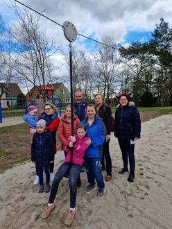 Am 25.03.2023 fand die Spielplatzeinweihung der zwei neuen Spielgeräte, eine Seilbahn und ein Federspiel, bei windigem Wetter statt.