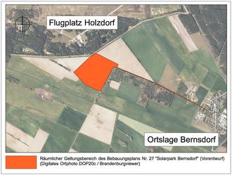 Mit der Aufstellung des Bebauungsplanes sollen die planungsrechtlichen Voraussetzungen für die Errichtung einer Freiflächen-Photovoltaikanlage geschaffen werden. Das Plangebiet befindet sich in der Gemarkung Bernsdorf und liegt nordwestlich der Ortslage Bernsdorf. Es weist eine Größe von 15,6 Hektar auf. Zum Plangebiet gehören die folgenden Flurstücke: Gemarkung Bernsdorf, Flur 1: 30, 35, 116, 120, 121/37 und 122/37 (alle teilweise) sowie Gemarkung Bernsdorf, Flur 2: 2, 5/1, 147, 223, 224 und 256/144 (alle teilweise). Das Plangebiet in Flur 1 wird derzeit intensiv landwirtschaftlich genutzt und ist unbebaut. Die Erschließung des Plangebietes in Flur 2 ist über einen bestehenden Wirtschaftsweg von der Ortslage Bernsdorf aus gesichert.
