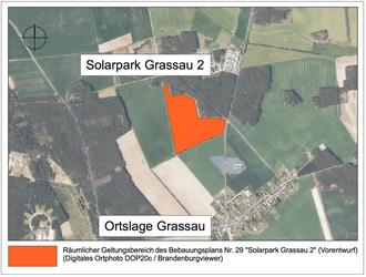Mit der Aufstellung des Bebauungsplanes sollen die planungsrechtlichen Voraussetzungen für die Errichtung einer Freiflächen-Photovoltaikanlage geschaffen werden. Das Plangebiet befindet sich in der Gemarkung Grassau und liegt nördlich der Ortslage Grassau. Es weist eine Größe von 19,8 Hektar auf. Zum Plangebiet gehören die folgenden Flurstücke: Gemarkung Grassau, Flur 3: 40, 41 und 42 (alle teilweise). Das Plangebiet wird derzeit intensiv landwirtschaftlich genutzt und ist unbebaut. Die Erschließung des Plangebietes ist über eine bestehende Zufahrt von der östlich flankierend verlaufenden Kreisstraße K 6250 aus gesichert.