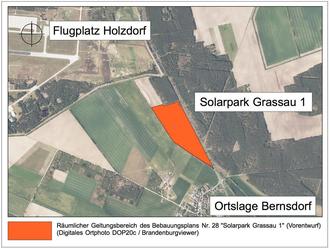 Mit der Aufstellung des Bebauungsplanes sollen die planungsrechtlichen Voraussetzungen für die Errichtung einer Freiflächen-Photovoltaikanlage geschaffen werden. Das Plangebiet befindet sich in der Gemarkung Grassau und liegt nördlich der Ortslage Bernsdorf. Es weist eine Größe von 12,5 Hektar auf. Zum Plangebiet gehören die folgenden Flurstücke: Gemarkung Grassau, Flur 7: 121, 123, 125, 127,129, 131, 133, 135, 138 und 140 (alle vollständig). Das Plangebiet wird derzeit intensiv landwirtschaftlich genutzt und ist unbebaut. Die Erschließung des Plangebietes ist über eine bestehende Zufahrt von der östlich flankierend verlaufenden Bundesstraße B 101 aus gesichert.