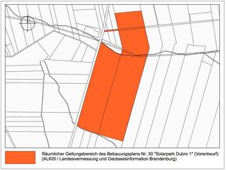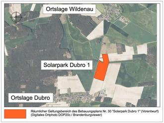 Mit der Aufstellung des Bebauungsplanes sollen die planungsrechtlichen Voraussetzungen für die Errichtung einer Freiflächen-Photovoltaikanlage geschaffen werden. Das Plangebiet befindet sich in der Gemarkung Dubro und liegt nördlich der Ortslage Dubro. Es weist eine Größe von 21,9 Hektar auf. Zum Plangebiet gehören die folgenden Flurstücke: Gemarkung Dubro, Flur 3: 85/6, 132/1, 247, 249, 250, 251, 252 und 326 (alle vollständig) sowie 85/5, 246, 267/121 und 277/84 (alle teilweise). Das Plangebiet wird derzeit intensiv landwirtschaftlich genutzt und ist unbebaut. Die Erschließung des nördlichen Teils des Plangebietes ist über einen bestehenden Wirtschaftsweg von der Landesstraße L 72 aus gesichert, die des südlichen Teils über eine bestehende Zufahrt direkt von der L 72.