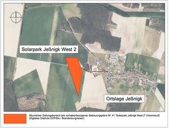 Mit der Aufstellung des Bebauungsplanes sollen die planungsrechtlichen Voraussetzungen für die Errichtung einer Freiflächen-Photovoltaikanlage geschaffen werden. Das Plangebiet befindet sich in der Gemarkung Jeßnigk westlich der Ortslage Jeßnigk und weist eine Größe von 9,3 Hektar auf, wovon 0,3 Hektar auf die Erschließungsfläche der vorhandenen Wirtschaftswege entfallen. Es bestimmt sich wie folgt: