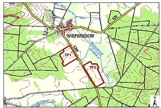 Der Geltungsbereich des Bebauungsplans umfasst eine Gesamtfläche von 34,83 Hektar und beinhaltet in der Gemarkung Wiepersdorf der Flur 6 die Flurstücke 43, 44, 51, 52 jeweils vollständig und die Flurstücke 54, 55, 56,57 jeweils teilweise, begrenzt im Westen durch die L721, im Norden durch Acker, im Osten durch Grünland, im Süden durch Acker und in der Flur 7 die Flurstücke 51, 52, 55 jeweils vollständig und die Flurstücke 50, 54 jeweils teilweise, begrenzt im Westen durch Wald, im Norden durch einen Feldweg, im Osten durch die L721, im Süden durch Acker.