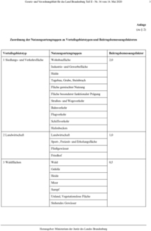 | 2. | Sind mehrere Nutzungsartengruppen für ein Grundstück verzeichnet, ist die Fläche anteilig entsprechend den amtlichen Flächenanteilen den jeweiligen VorteiIsgebietstypen zuzuordnen. |