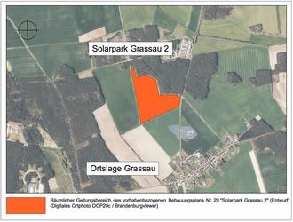 Die Stadtverordnetenversammlung der Stadt Schönewalde hat in ihrer öffentlichen Sitzung vom 30.04.2025 den Entwurf des vorhabenbezogenen Bebauungsplans Nr. 29 "Solarpark Grassau 2" (Stand 10.03.2025) beschlossen, die dazugehörige Begründung sowie Umweltbericht und Artenschutzfachbeitrag gebilligt und zur förmlichen Beteiligung der Öffentlichkeit gem. § 3 Abs. 2 BauGB, der Behörden und sonstigen Träger öffentlicher Belange gem. § 4 Abs. 2 BauGB sowie der Nachbargemeinden bestimmt.