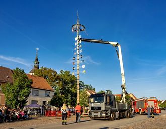 Gegen 18 Uhr rollte die Fahrzeugkolonne mit dem Maibaum auf dem Marktplatz ein und das Aufstellen erfolgte unmittelbar danach. Auch in diesem Jahr unterstützte hierbei die Firma „Hecker System Haus GmbH“ mit einem Kranfahrzeug. Ein großes Dankeschön an dieser Stelle.
