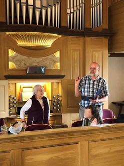 Herr Homa erzählte uns zu Beginn vieles Interessantes über die Geschichte unserer Kirche, bevor wir dann den Blick nach oben richteten und von Frau Sandt vor der Orgel begrüßt wurden.