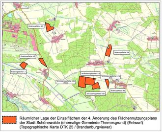 Die Unterlagen zum Entwurf der 4. Änderung des Flächennutzungsplanes der Stadt Schönewalde (ehemalige Gemeinde Themesgrund), bestehend aus zwei Planzeichnungen, der Begründung sowie acht standortbezogenen Umweltberichten (alle Stand 30.06.2025) und den nach Einschätzung der Stadt wesentlichen, bereits vorliegenden umweltbezogenen Stellungnahmen, sind in der Zeit