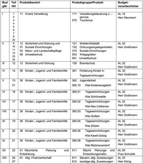 | 1. | Der Haushalt gliedert sich in 27 Teilhaushalte. Die Teilhaushalte werden wie folgt zu 12 Budgets verbunden: |