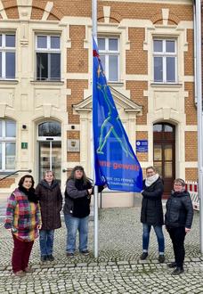 Seit Jahren steigen die Zahlen der erfassten Gewalttaten. Alle 45 Minuten wird eine Frau durch ihren Partner oder Ex- Partner angegriffen oder verletzt. An fast jedem dritten Tag stirbt eine Frau aufgrund der Gewalttat ihres Partners. Die Opfer sind in 81 Prozent der Fälle Frauen. Die Statistik umfasst Delikte wie Mord und Totschlag, Körperverletzung, Vergewaltigung, sexuelle Nötigung, Bedrohung und Stalking sowie Freiheitsberaubung. Die Dunkelziffer ist noch viel höher: Viele Fälle werden leider gar nicht erst gemeldet und somit auch nicht offiziell erfasst. Darüber hinaus sind Frauen auch im öffentlichen Raum, am Arbeitsplatz, in Bildungseinrichtungen und zunehmend auch im Internet von Gewalt betroffen. Deshalb lege ich Ihnen ans Herz: Seien Sie aufmerksam in Ihren Familien, Nachbarschaften, Freundeskreisen, in Ihrem Arbeitsumfeld, in der Schule oder auch im Internet! Holen Sie Hilfe, wenn Frauen und Mädchen beschimpft, beleidigt oder bedroht werden. In diesem Jahr hisste Bürgermeisterin Andrea Schulz im Beisein von Mitarbeiterinnen der Verwaltung und der Stadtverordneten Daniela Maurer die Fahne vor dem Golßener Rathaus.