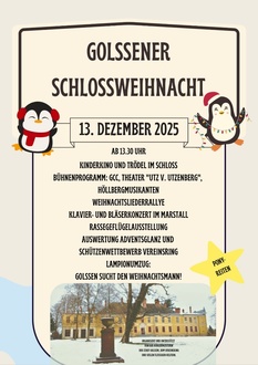 Am 13.12.25 findet die Golßener Schlossweihnacht im Schlosspark am Schloss statt.