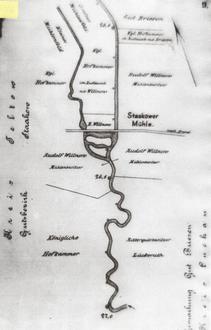 Auf dem Blatt 9[3] sind die Besitzverhältnisse zur und um die Staakower Mühle[4] eingetragen. Interessant ist dabei, dass die Mühle in der Gemarkung des Gutes Briesen Kreis Luckau lag und der angrenzende Gutsbezirk Staakow dem Kreis Teltow zugeordnet ist. Mühlenbesitzer war damals Rudolf Willnow. Seine Mühle lag mitten in den Besitzungen der Königlichen Hofkammer und des Ritterguts Lückerath. Auf dem Blatt 10 sind dann entlang der Dahme als Flurbezeichnungen Kleines und Großes Mühlenfeld, der Horst und das Gut Briesen eingetragen. Willnow nannte ab Kilometer 25 zwei weitere größere Flurstücke sein Eigentum. Die auch heute noch vorhandene Straße nach Briesen wurde damals als „nach Brand“ führend eingetragen. Als Flussverlauf ist zwischen den Kilometern 25,5 und 26,5 der Dahme deutlich ihre Begradigung zu erkennen. Für den Mühlenbetrieb war das sicherlich erforderlich gewesen. Vorher und anschließend bis Wendisch Buchholz schlängelt sich die Dahme wieder gemütlich, vorbei an den Gemarkungen Theurow Blatt 16 und Freidorf Blatt 14, durch die flache Landschaft. Auch Theurow und Freidorf gehörten damals zum Kreis Luckau. Trotzt des recht schwachen Gefälles der Dahme war sie mit vielen Mühlen bestückt, erwähnt sollen u. a. die in Liedekahle, Krossen oder Teurow sein. Alle Mühlen benötigten einen angestauten Wasservorrat für ihren Betrieb. Der Stau für die Staakower Mühle lag oberhalb der erwähnten Straße. Von der damaligen Betriebsamkeit ist heute allerdings nichts zu spüren.