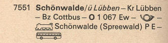 Gemeinde mit 302 Einwohnern - Postdienststelle - Bahnhof Schönwalde 4 km und Hbf Lübben 11 km - Haltestelle im Kraftomnibusverkehr (auf S. 144)