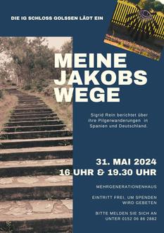 Am 31. Mai wird Sigrid Rein über ihre Pilgerwanderungen auf den Jakobswegen in Spanien und Deutschland berichten. Ein spannender Nachmittag bzw. Abend ist garantiert. Die Veranstaltung findet jeweils um 16.00 und 19.30 Uhr statt. Vor Ort können Getränke und Snacks für einen gemütlichen Nachmittag bzw. Abend erworben werden. Um Anmeldung unter 01520 6862882 wird gebeten. Der Eintritt ist frei; wir sammeln Spenden für die dringend erforderliche Reparatur des Schornsteins und der Regenrinnen am Schloss.